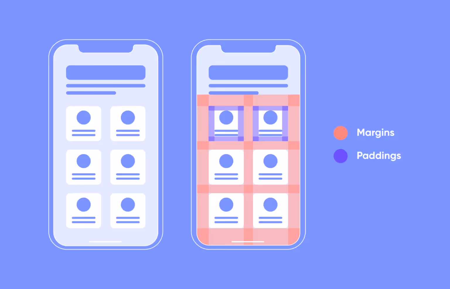 There are two main characteristics of interface spacing: paddings and margins. Padding is the inner element space, while the margin is whitespace surrounding an element. The paddings and margins between interface elements, such as buttons, text blocks, icons, add “air” to the screen and make the meditation app design more expressive.
