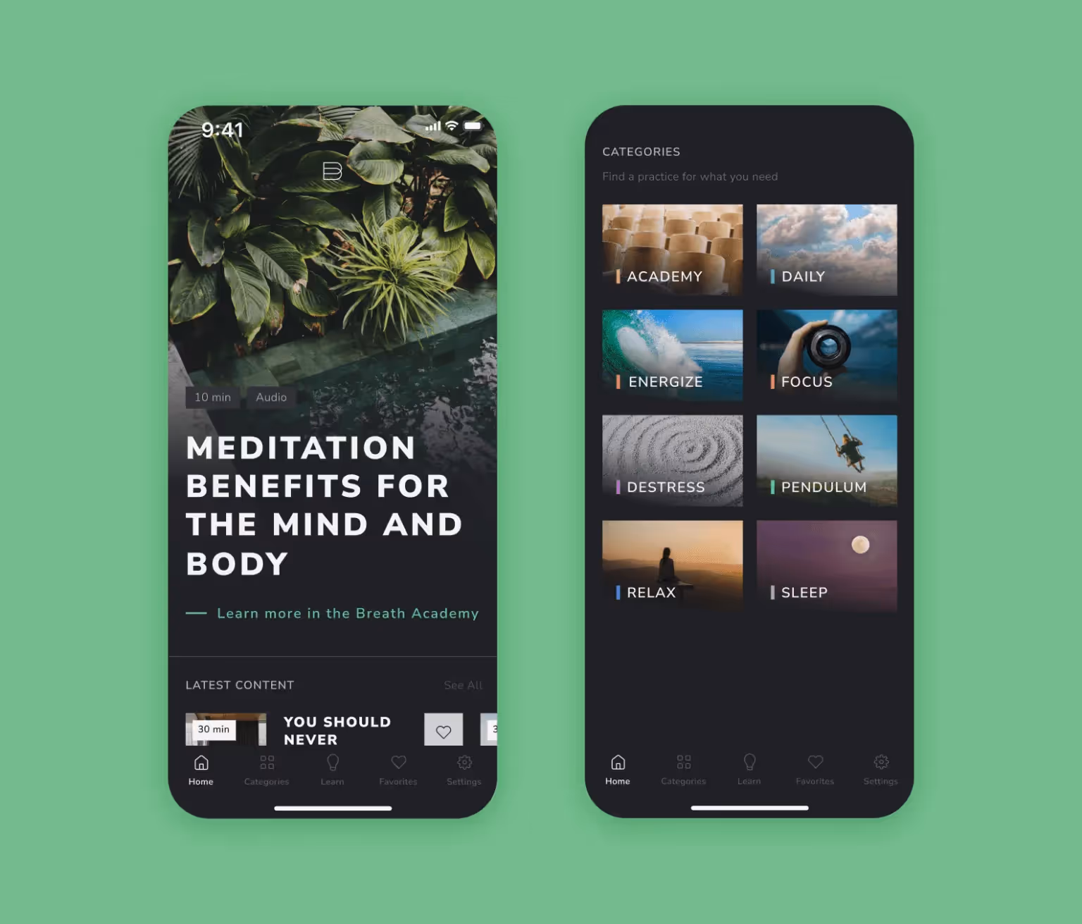 Photos of nature are an essential part of the meditation app design. Natural motives — water, stones, plants — relax well. The user can customize the screen to suit their mood.