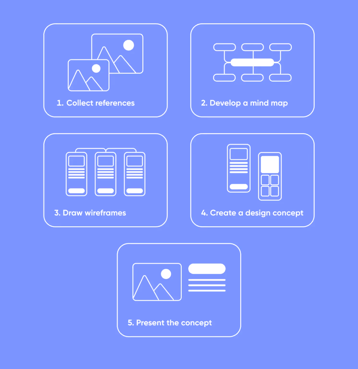 Black and white prototypes of app screens. This way, you'll determine where the main elements of the screen will be located.
