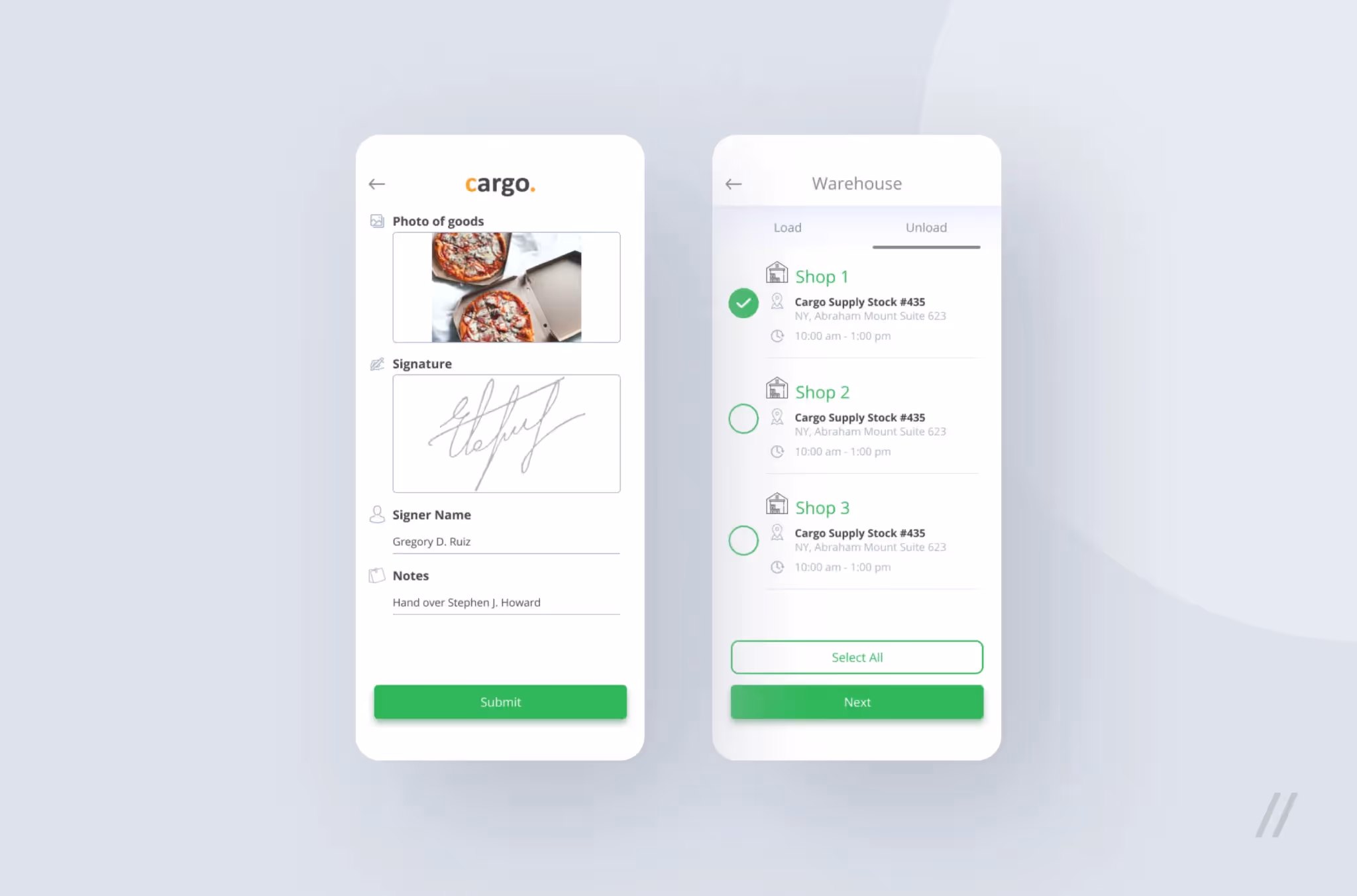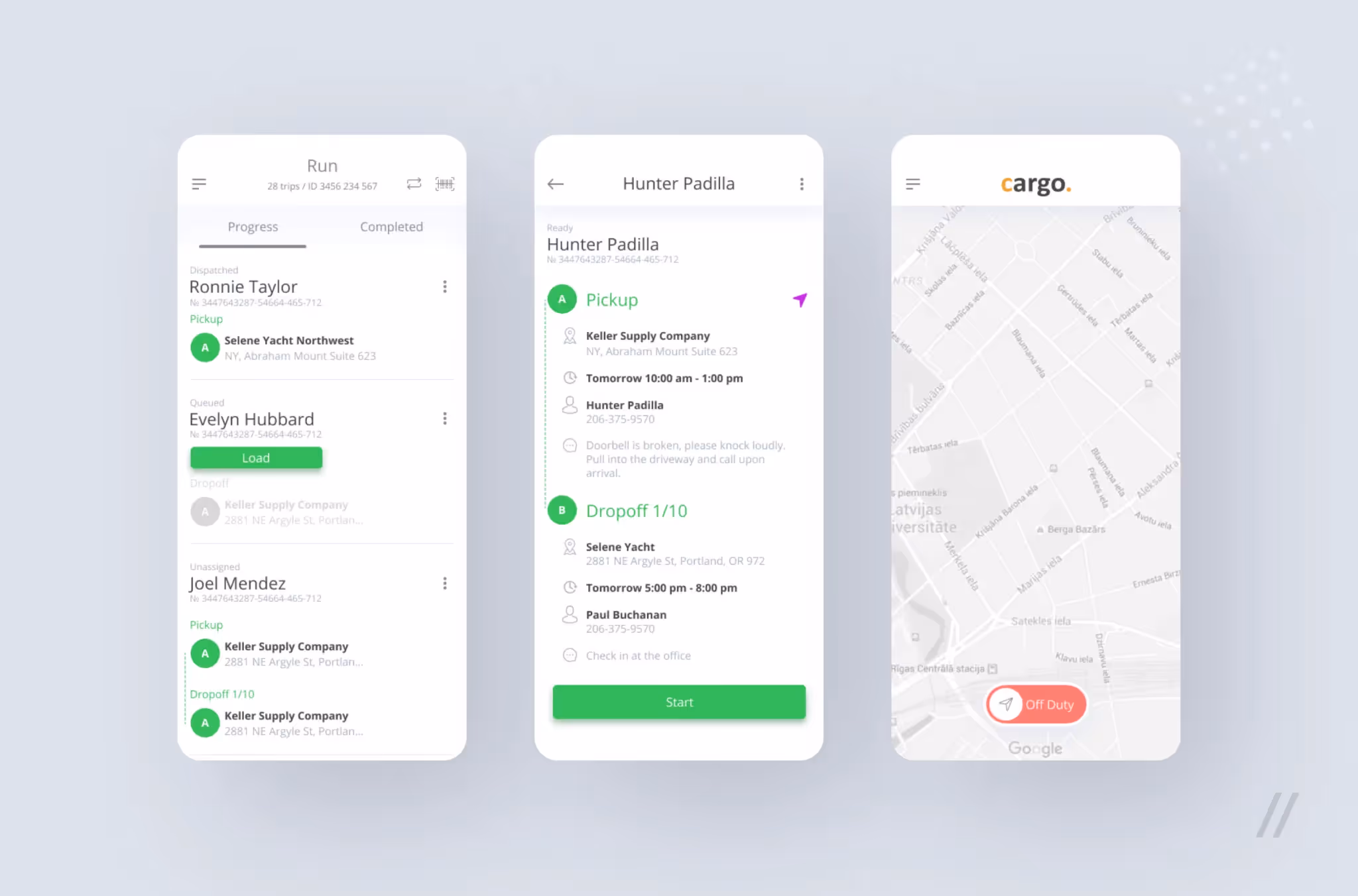 Here is the main flow of Cargo app. The courier arrives at the warehouse, opens the application, notes his status and gets to work. The second screen displays a list of packages that should be delivered today. The courier finds them in the warehouse, then scans their barcodes or manually enters the packages’ codes: this procedure means that the parcel is now under the courier’s responsibility. As soon as all the parcels are loaded, the courier receives a route list in which the recipients are sorted in the most convenient way. Since couriers usually move around the city by car, we integrated the GPS navigator into this on-demand delivery app. When the courier hands the package to the recipient, the parcel must be scanned again, and after that, he can proceed to the next point.