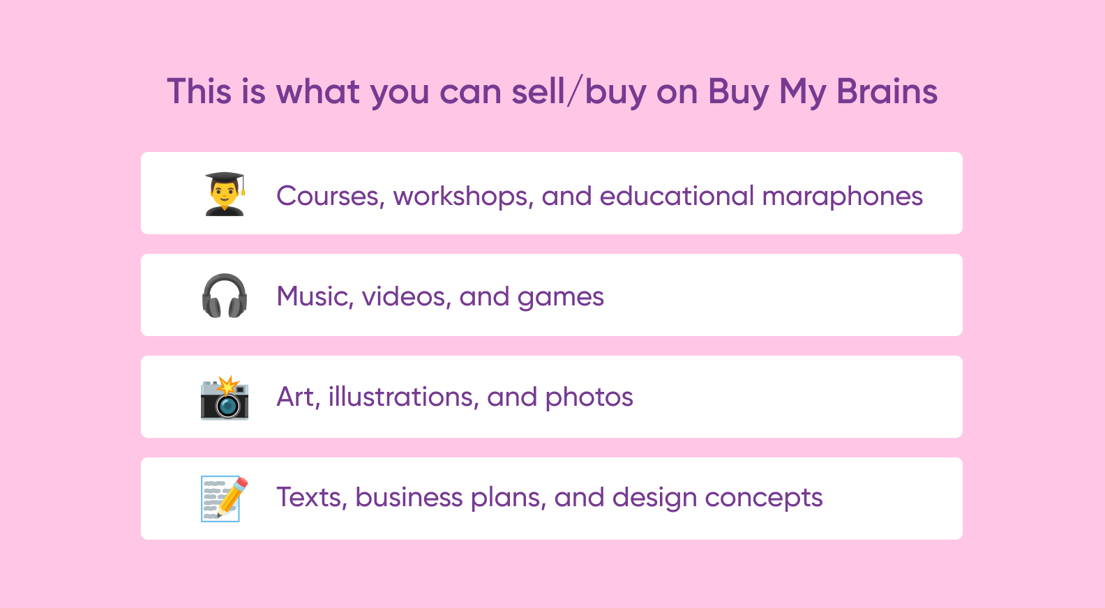 On Buy My Brains, artists, photographers, designers, experts, bloggers, screenwriters, writers, and composers — in short, anyone who can create something non-material — can post their products.