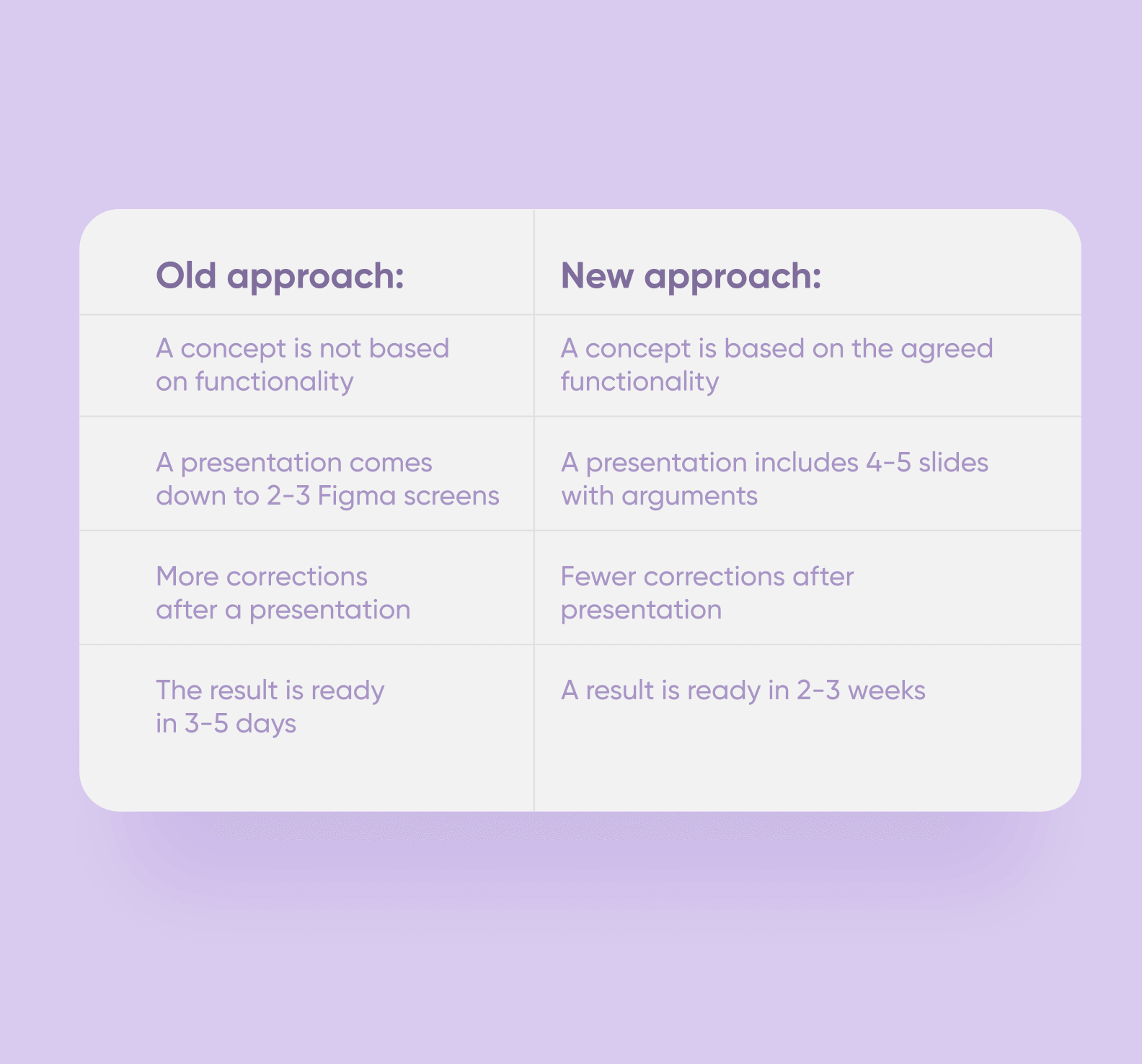 The new process takes more time: for example, it took half of the entire design process in the crypto wallet project. However, now we complete more designs, whereas with the 16-hour approach projects used to get abandoned pretty often. Our clients are more often satisfied with the result and continue to collaborate with us after the concept presentation. So, the new approach proves workable.