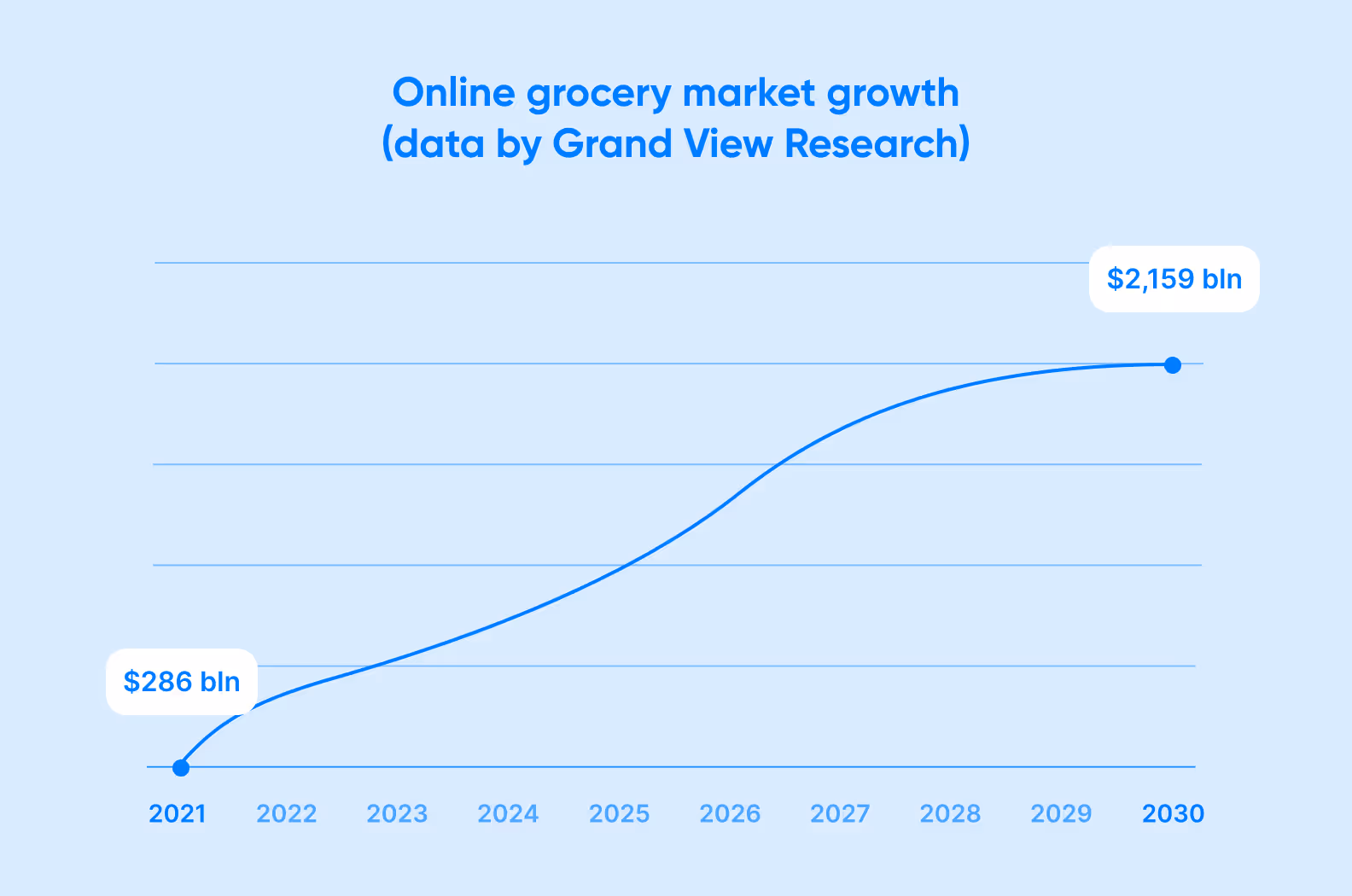 The global online grocery market is expanding rapidly: having grossed $286 bln in 2021, it’s expected to reach a staggering $2,159 bln by 2030. The primary driver of the demand for grocery delivery apps is the opportunity to save time and avoid physical shopping in-store. Another factor is the growing preference for e-commerce, largely spurred by the pandemic and the increasing availability of mobile devices. More people than ever are now opting to buy necessities online, and this is going to become even more commonplace in the coming decades. The key takeaway: 2025 is a perfect year to develop a grocery delivery app.