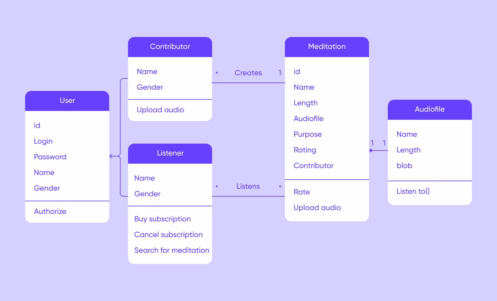 As you can see, our app has two subtypes of users. Contributors add their own guided meditation recordings to the app library — they create new objects in the “meditation” class. Listeners can only listen to uploaded files from the library and buy or cancel subscriptions. Meditations have user ratings and contributors who created and uploaded them. Apart from standard metadata, meditations are also classified by purpose — like anxiety, productivity, or better sleep. There’s one audio file for each meditation. It’s a “blob,” or a Binary Large Object, which means that audio recordings are stored as binary datasets.
