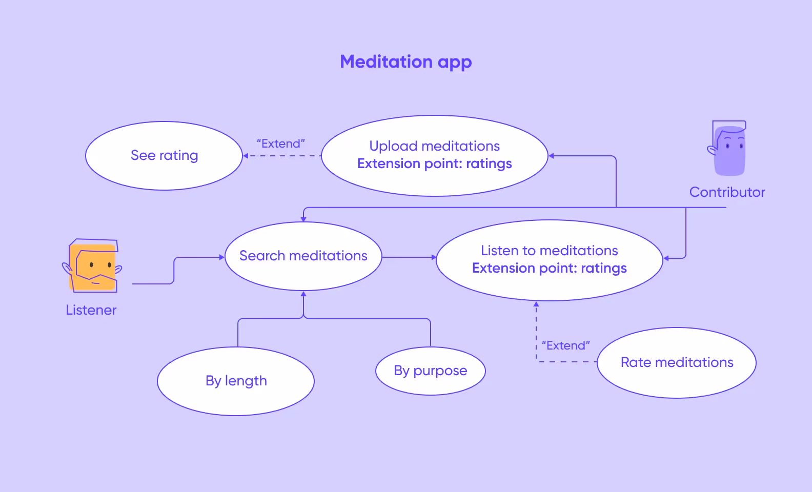 Another shtick of our diagram is optional use cases. Extend relationships show that the child use case is a possible scenario that is available but is not necessarily followed, for example, listeners can rate meditation recordings but they don’t have to do it. Finally, the “search by length” and “search by purpose” use cases are more specific versions of the “search for meditations” use case.