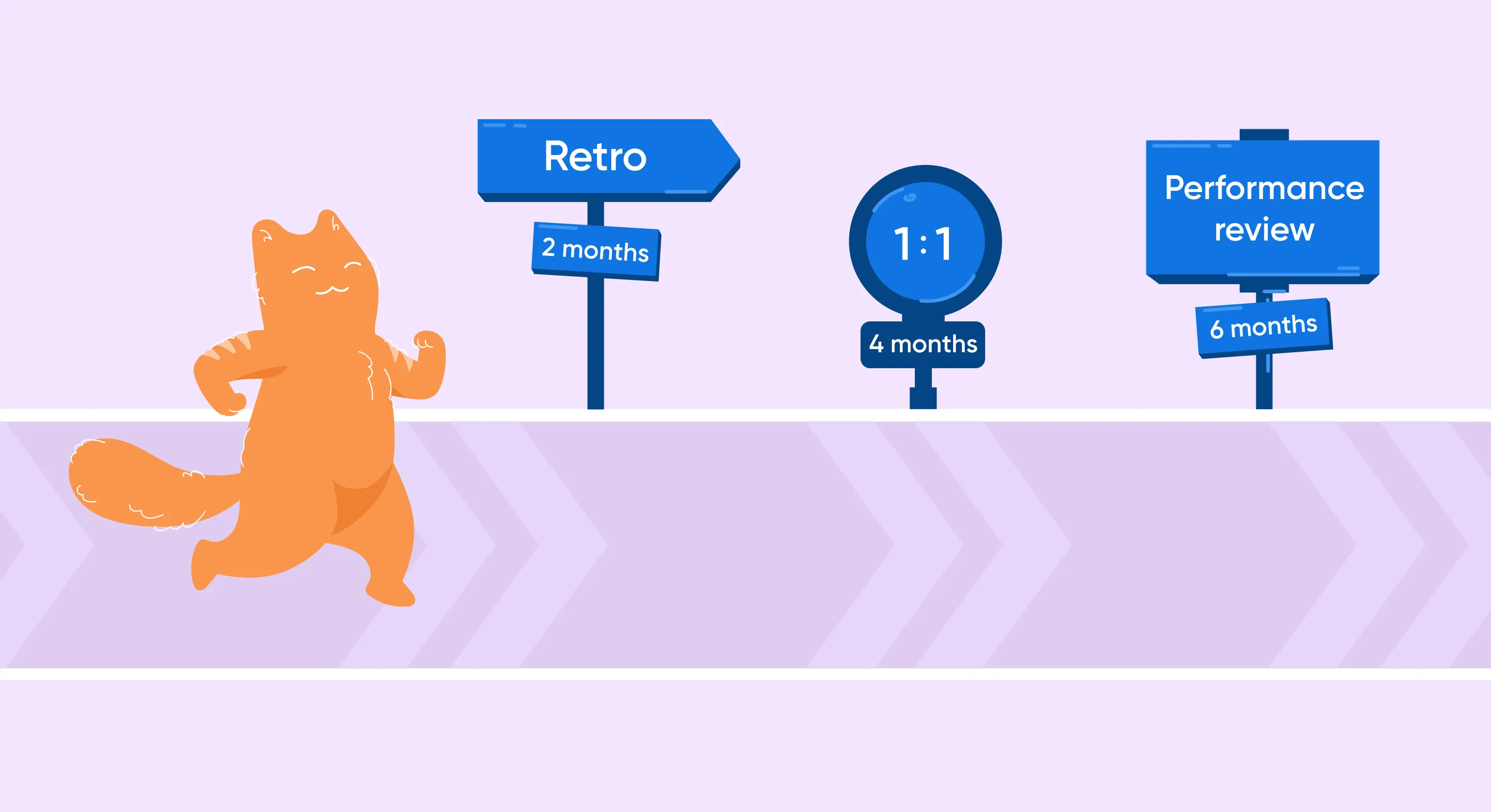 For the first half of the year, our employee follows this scheme: retros — a 1:1 performance review. On their first day, we briefly describe the process and then, we share detailed information before every meeting.