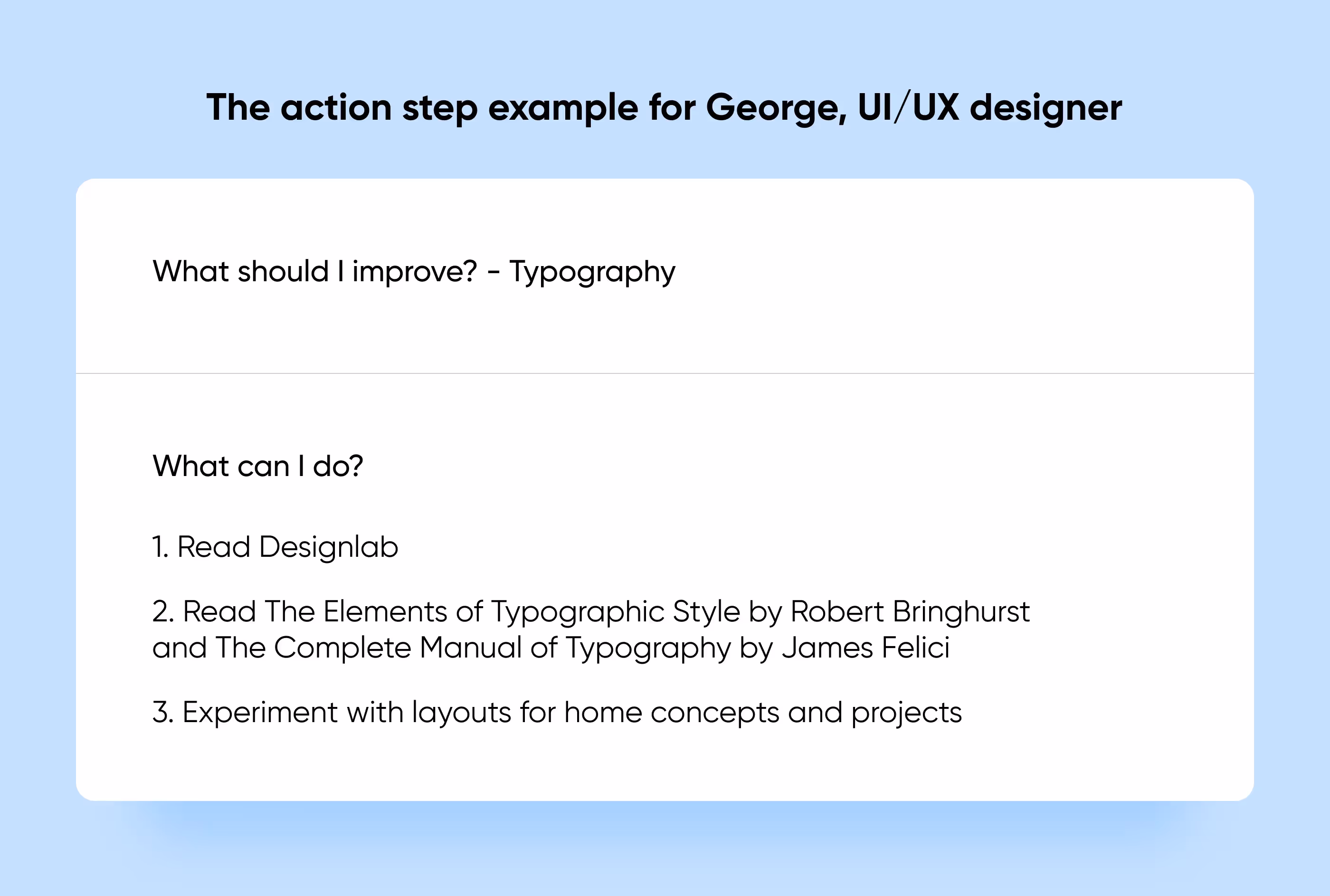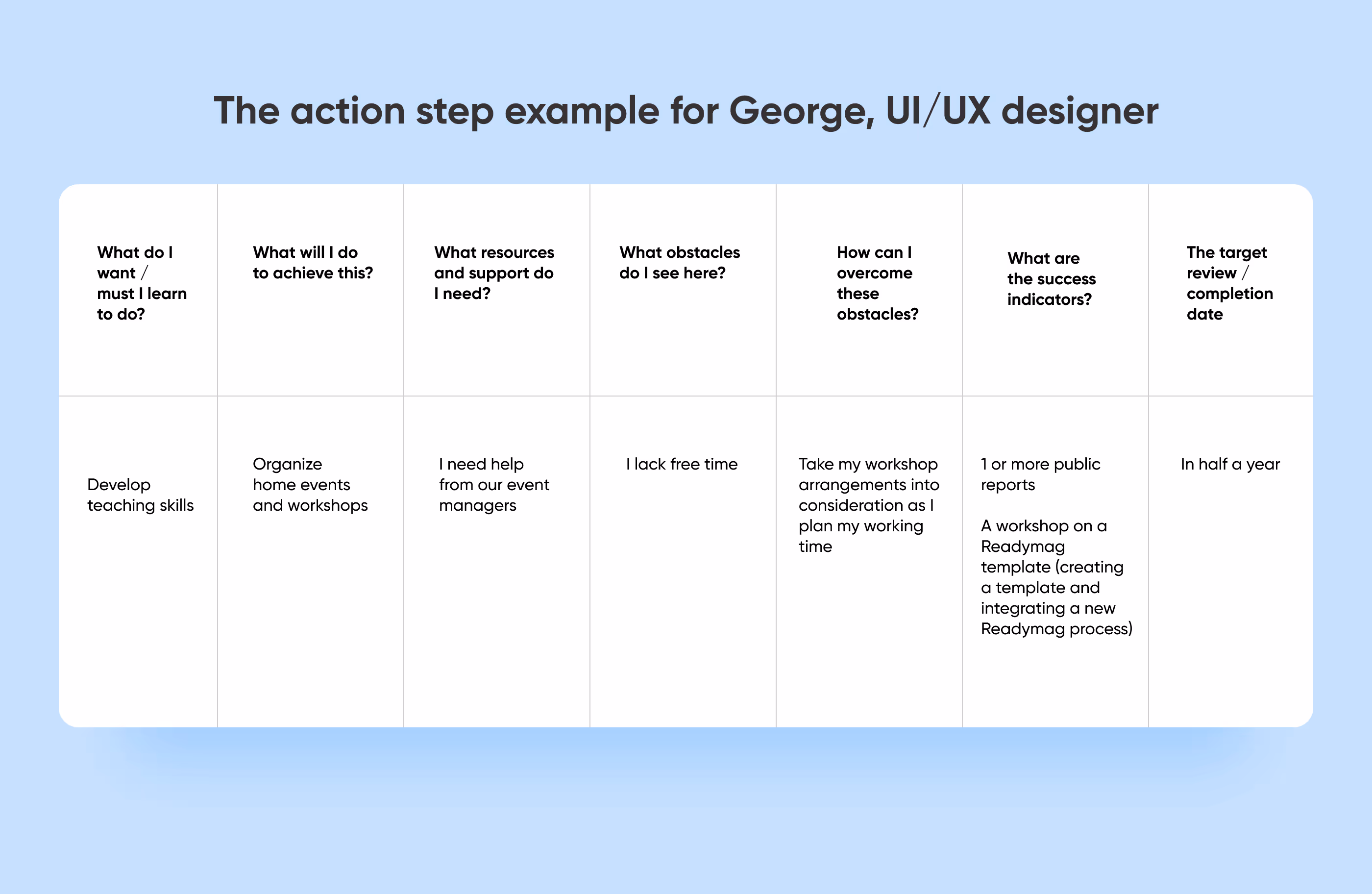 IDP is a table where the employee and the team lead enter the growth areas and come up with the action steps to boost a skill. It’s crucial for an employee not to follow someone else’s guidelines but to independently decide on the tasks and create an action plan. In this case, the employee is more likely to meet the deadlines.