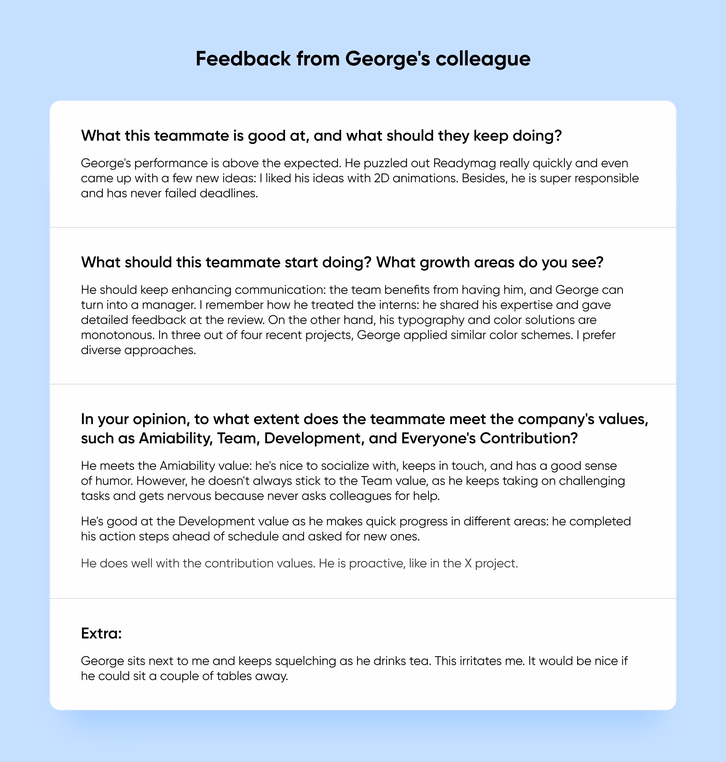 The HR in charge makes a monthly list of the employees who need a review. They request the contacts of the people they have interacted with. Then they create a special chat where they announce: “Hey! Join us for George’s upcoming review!” and ask to fill in a Google form. The form includes questions on George’s performance: they help find out if George meets their expectations and the company’s values.