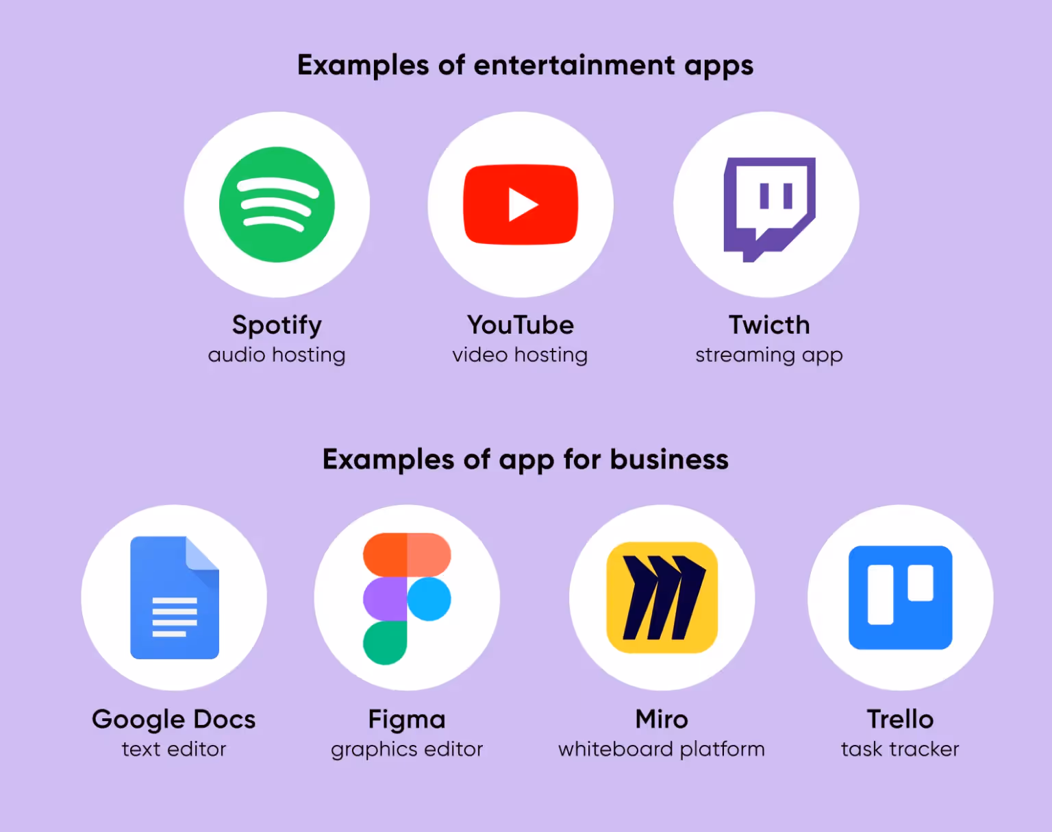 Now let’s take a closer look at integrations. Explore the possibilities of integrating your product with popular apps to build a full-fledged ecosystem for your users. Think about what programs will be important for your users to interact with. See some examples of business and entertainment apps below.