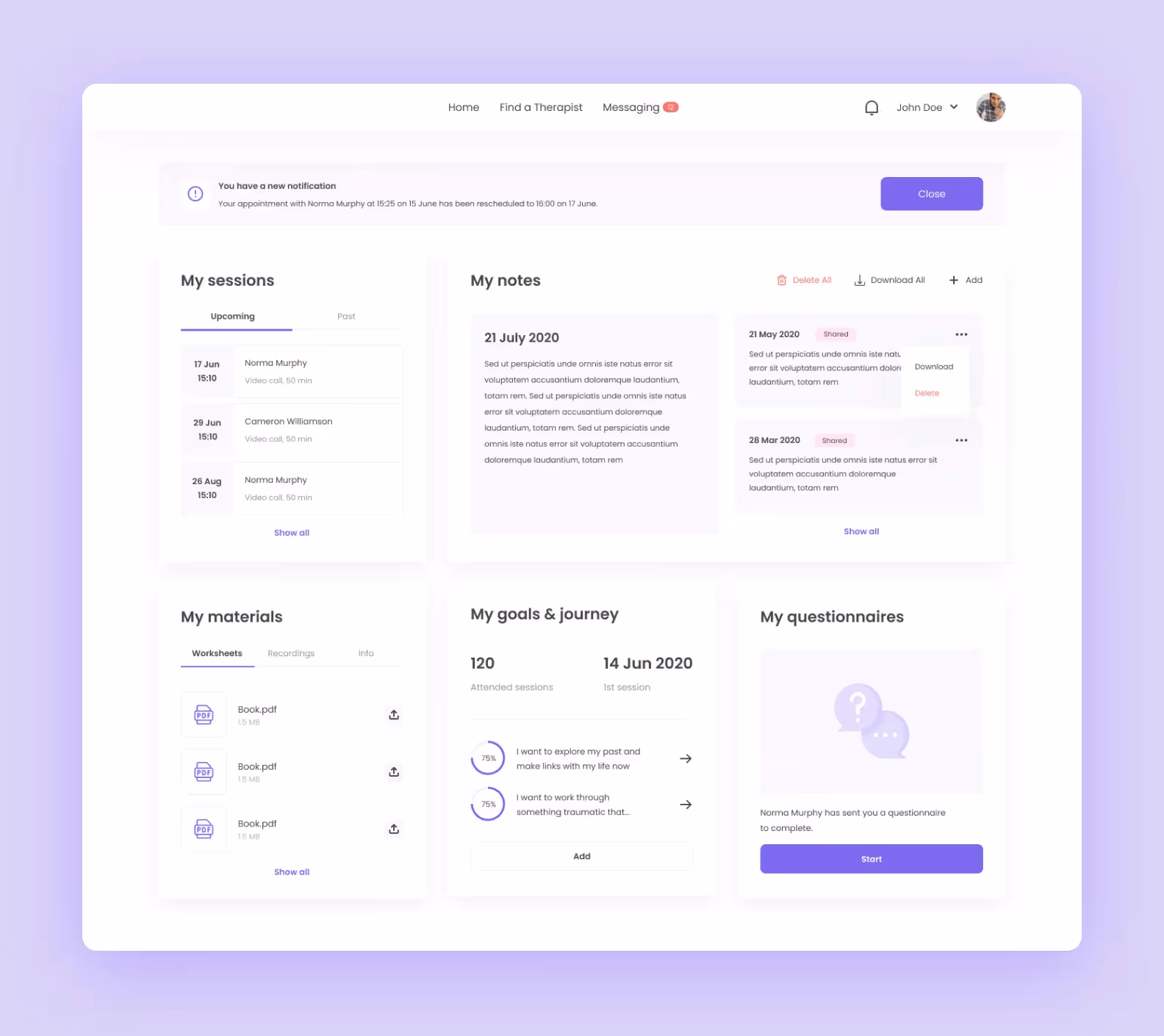 Service is very detailed for every user role. For example, patients can monitor all the previous and upcoming sessions, make notes, keep all the materials for therapy in one place, and track therapy goals. They can also chat with therapists and look through doctors’ profiles.