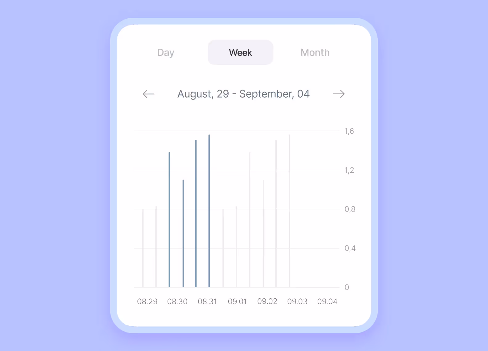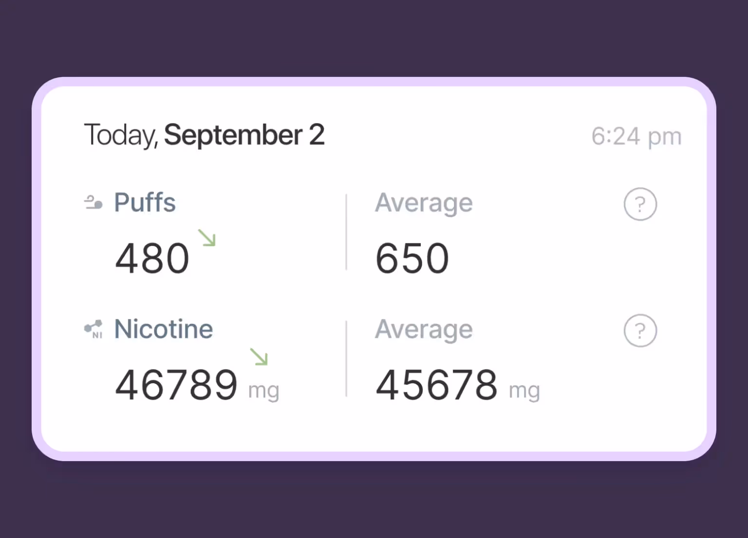 The number of puffs and smart statistics. The minimalist dashboards show the number of puffs a user has made over a day and compare it to the average number for a day, week, or month. If a user leaves the Bluetooth zone — for example, if they go out with a device but without a phone — the app automatically updates the statistics after the reconnection.