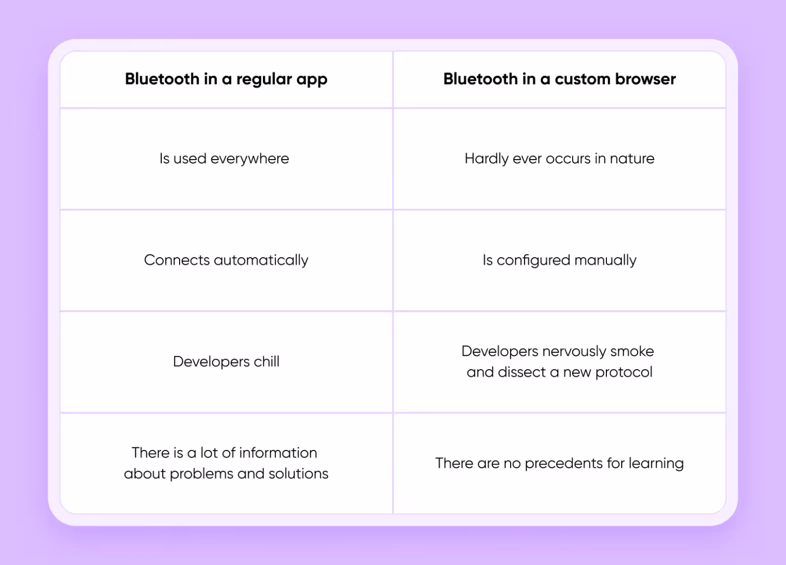 It’s different with browsers. The Android Chrome version supports the Bluetooth API, but Safari doesn’t have such a feature — it doesn’t connect to Bluetooth. Fun fact: under the hood, all the iPhone browsers are Safari-based, so they were all useless in our case.