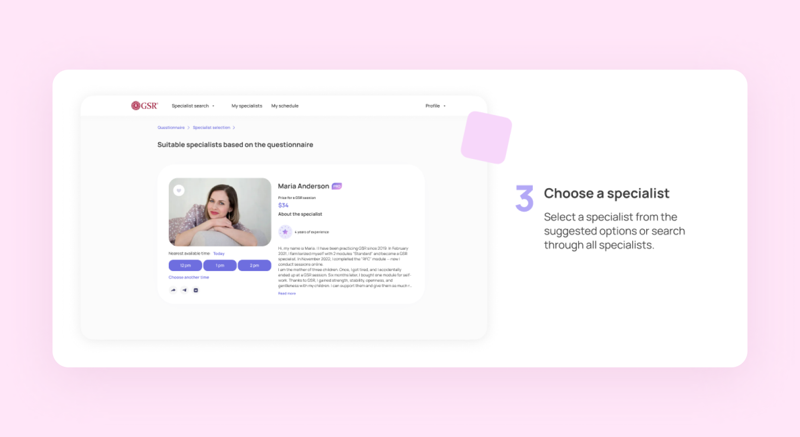 The user can independently choose a specialist among all the psychologists presented on the service, using the following parameters: work experience, level of expertise, or session cost.
