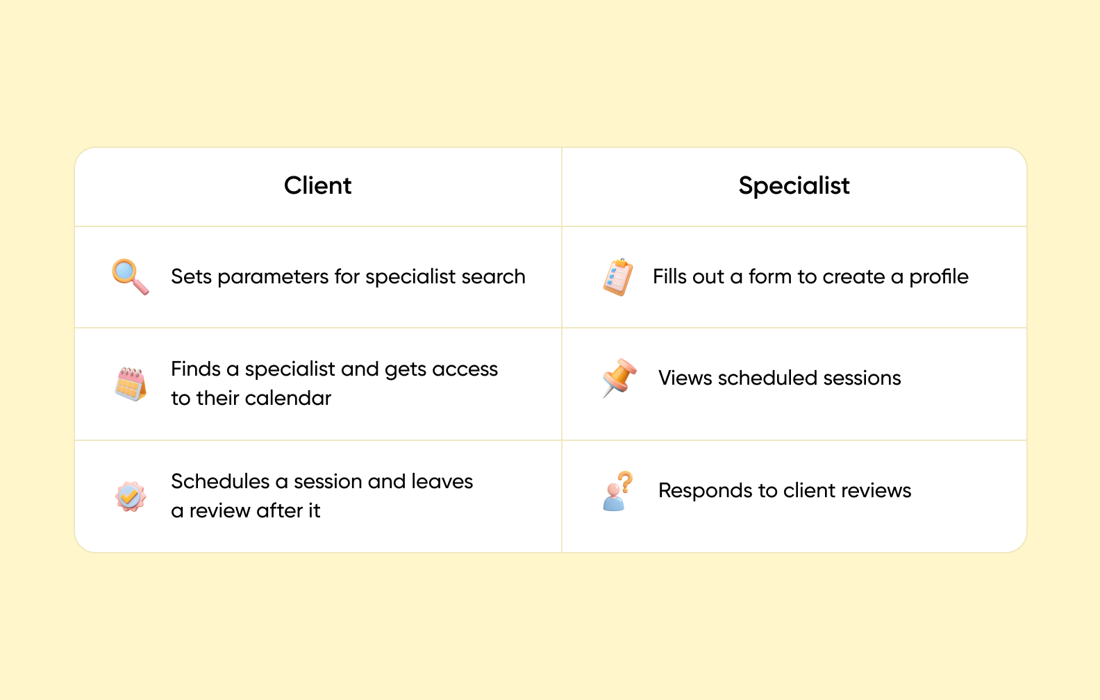The platform’s flow was supposed to have two roles: client and specialist. The actions available to them were different, so we had to think through two user journeys.