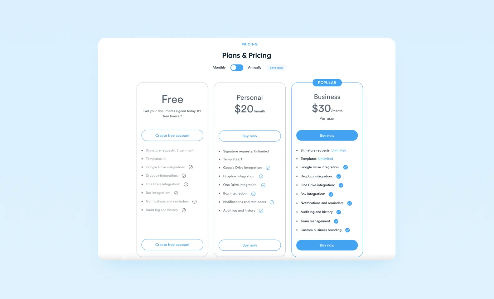 Our main reference was HelloSign. Price was the parameter that differed our project from the competitor — the client was ready to give access to the service at a lower price. Apart from that the service is very similar to HelloSign: legal in more than 60 countries, allows users to save signatures and get notifications.