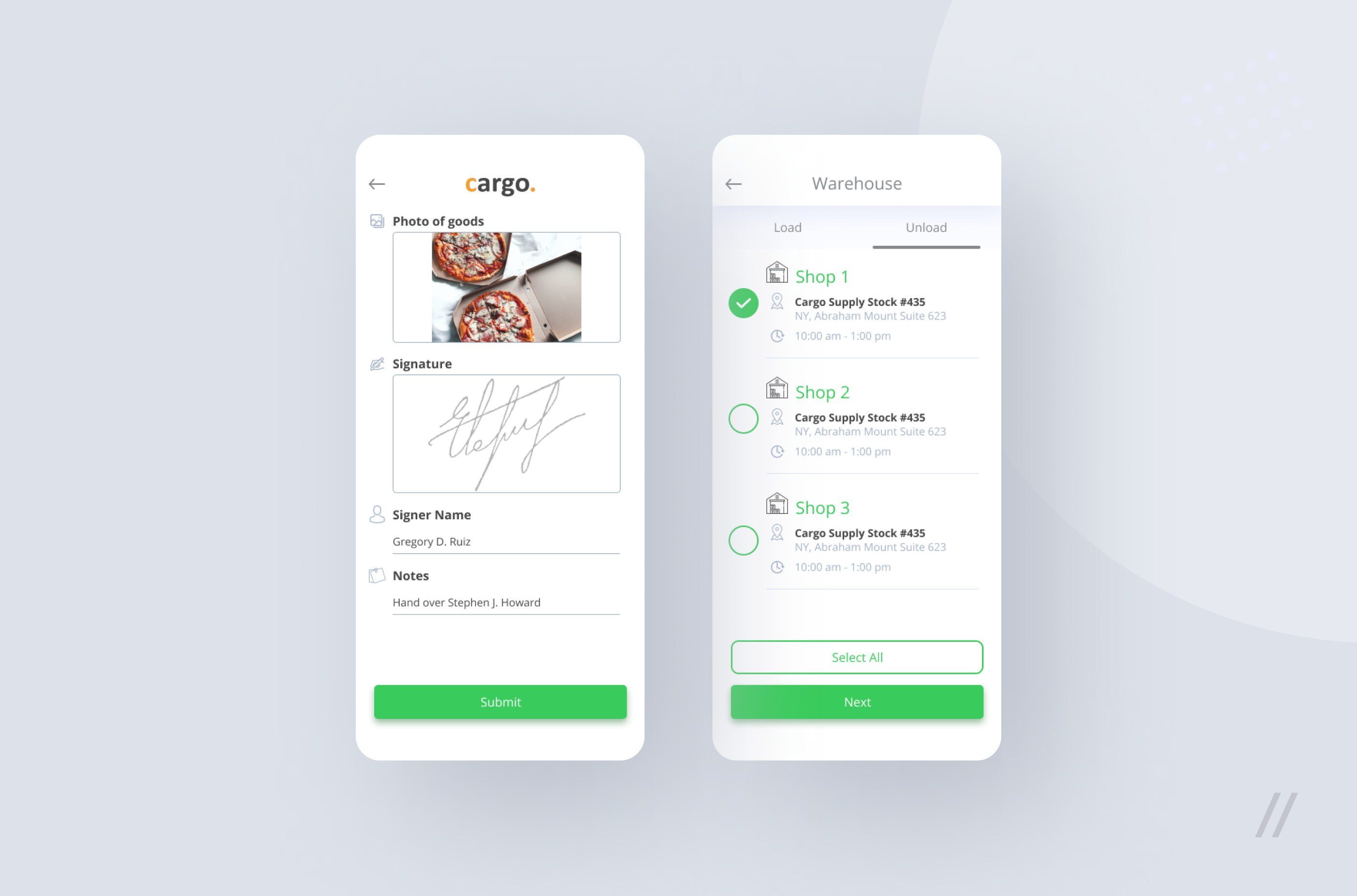 Here is the main flow of Cargo app. The courier arrives at the warehouse, opens the application, notes his status and gets to work. The second screen displays a list of packages that should be delivered today. The courier finds them in the warehouse, then scans their barcodes or manually enters the packages’ codes: this procedure means that the parcel is now under the courier’s responsibility. As soon as all the parcels are loaded, the courier receives a route list in which the recipients are sorted in the most convenient way. Since couriers usually move around the city by car, we integrated the GPS navigator into this on-demand delivery app. When the courier hands the package to the recipient, the parcel must be scanned again, and after that, he can proceed to the next point.
