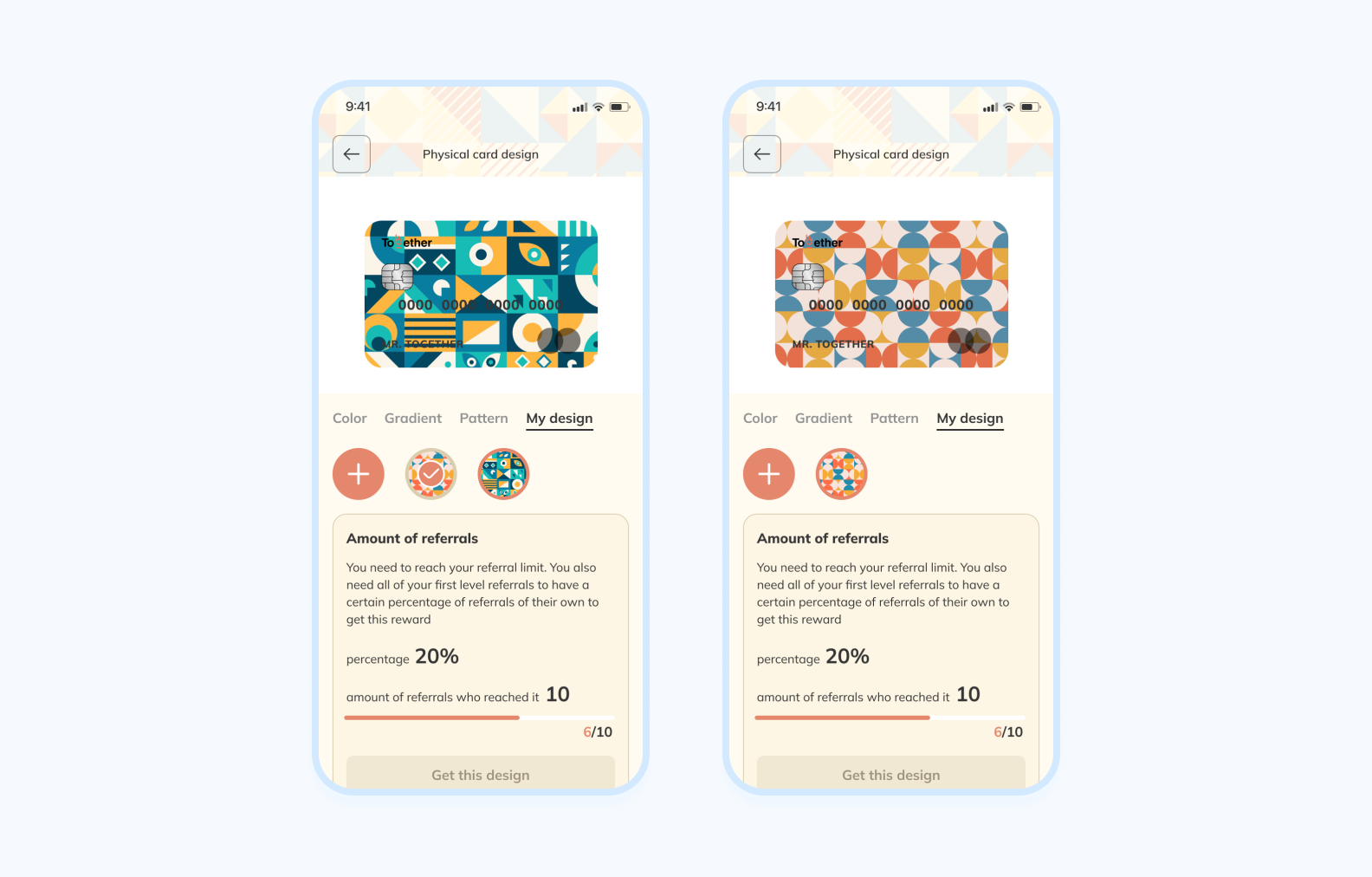 Also, Together has a referral program for users. A user can invite a friend to the app and get bonus points that can be converted into money later. Besides, it allows users to customize QR codes or the design of the physical payment card… wait, a physical payment card?