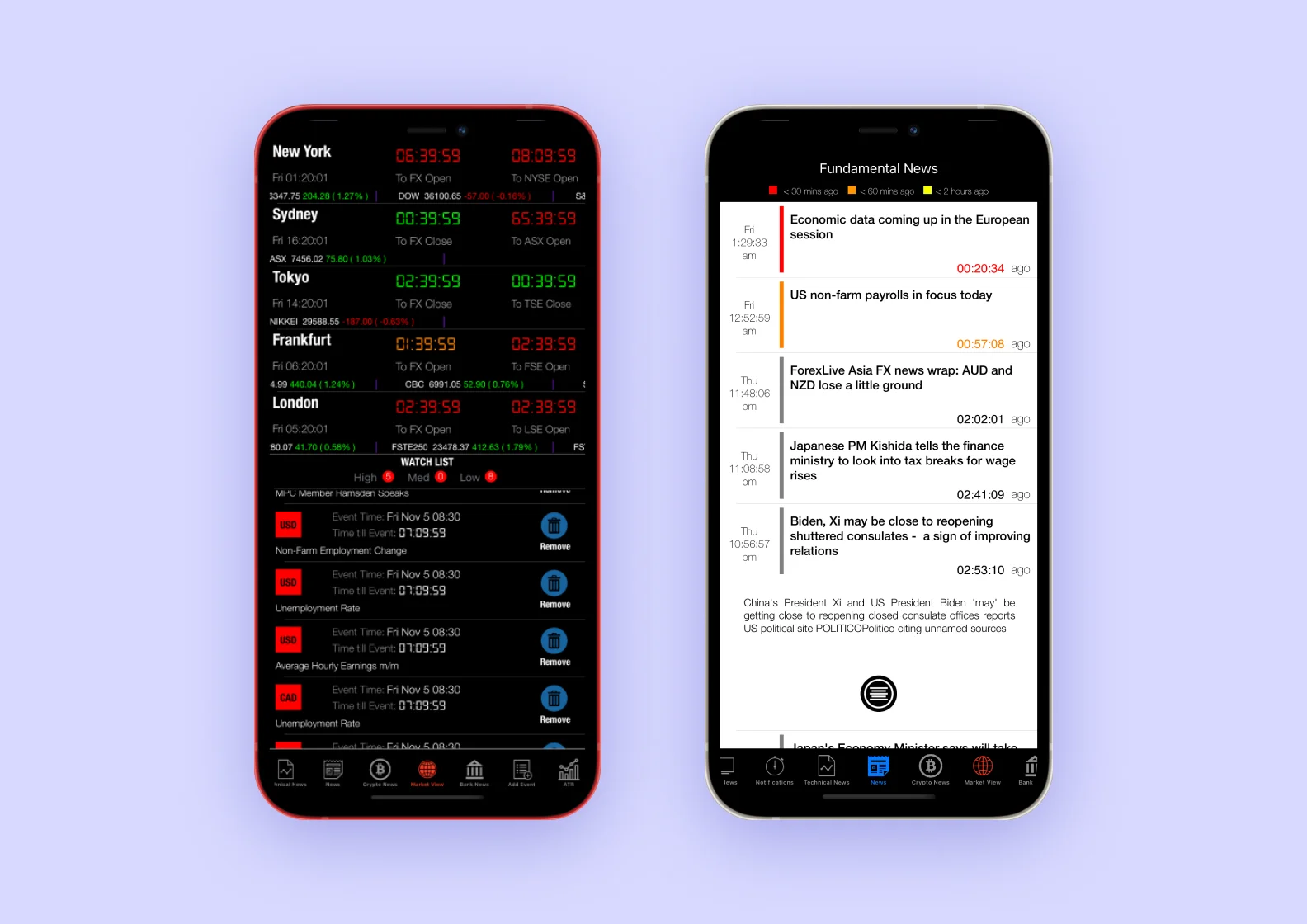 Forex Watch is an iPhone app designed to meet the needs of traders who need quick access to quotes, charts, and trading news at any time. It provides information on the open and close times of major markets around the world. It also displays the news, color-coded depending on their impact on a particular currency pair.