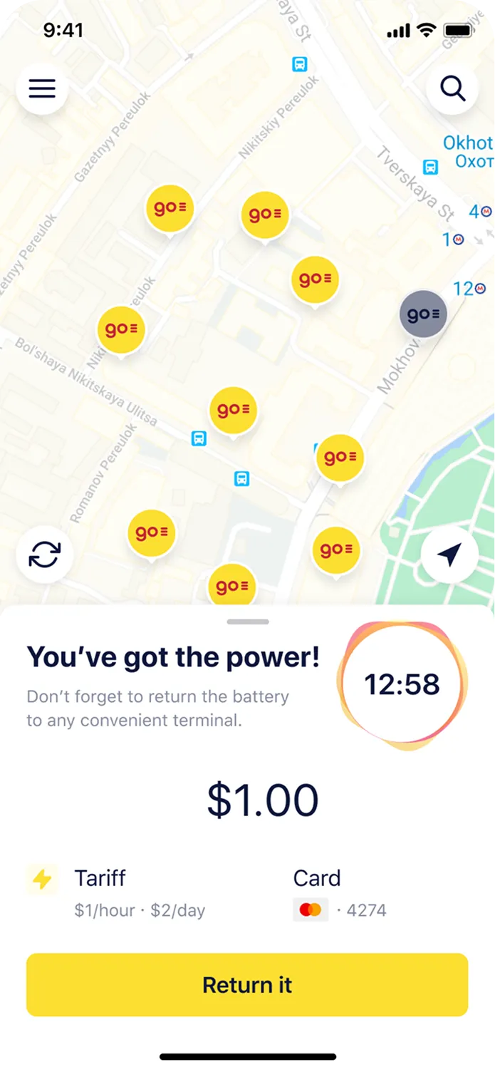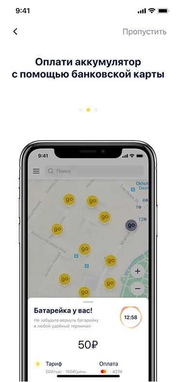 Users will learn how renting a power bank works from the very beginning. We added a bright onboarding with custom illustrations — it clearly demonstrates the basic idea of Energo.