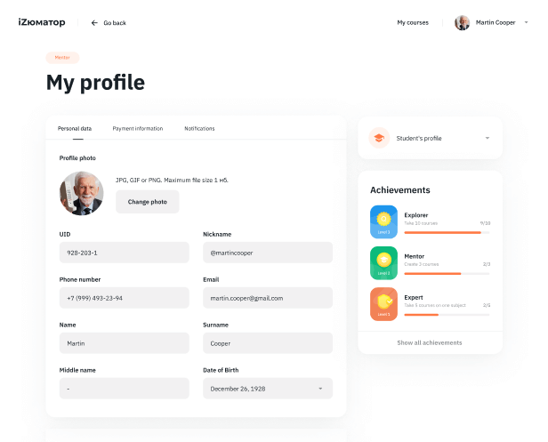 Users on the platform have 5 roles — student, mentor, assistant, admin, and supervisor. Our major challenge was the hierarchy of roles: admin has all rights, mentor has rights of students, and so on — every bigger role includes the rights of the smallerones. Users can switch between the roles in account settings.