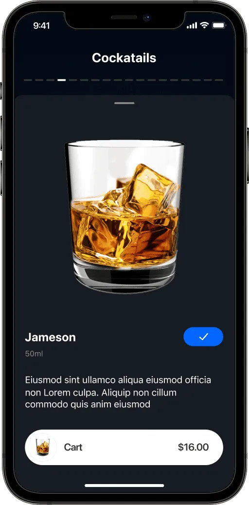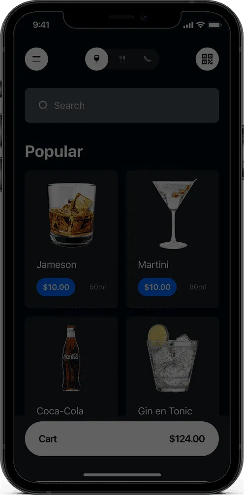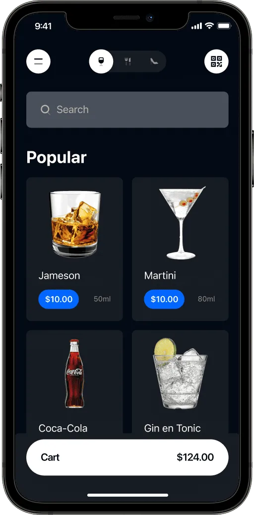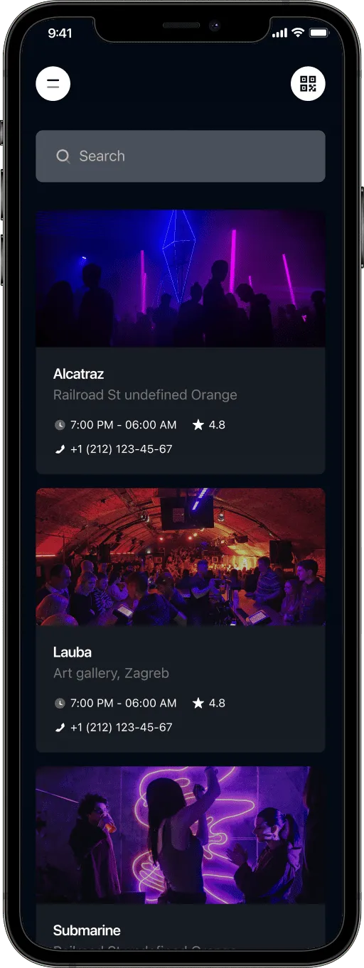 The app is designed to work in a dark mode. Not unintentionally, of course. By choosing dark tones we minimized the eye strain effect, because it’s always dark at night clubs. We added accents on the most important things for guests — prices and pictures.