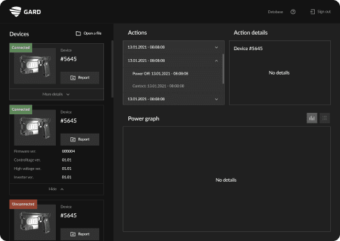 The UI comprises three blocks: the device, shot details and a discharge chart. This structure enhances navigation. It takes a user only two clicks to view a discharge chart.