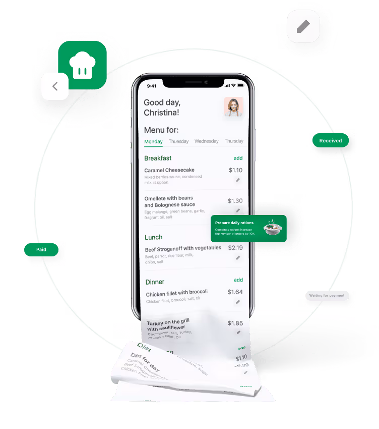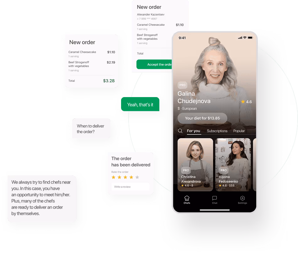 2 roles. 3 main scenarios. For customers — search and order. For cooks — order fulfillment. The classic marketplace.