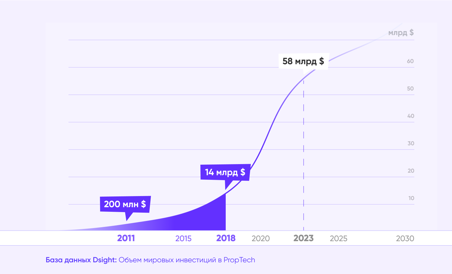 Согласно базе данных Dsight, объем мировых инвестиций в PropTech (рынок IT-технологий в недвижимости) вырос с 200 миллионов долларов в 2011 году до 14 миллиардов к 2018 году. Учитывая эти цифры, к 2023 году объем инвестиций может увеличиться в 4 раза до 58 миллиардов долларов.