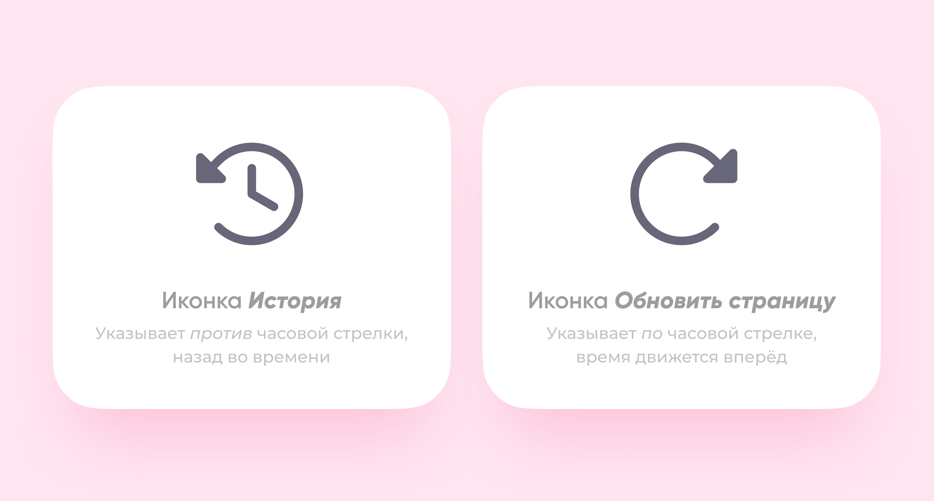 Круговое отображение времени. В отличие от кнопок «Undo» и «Redo», которые указывают направление времени, иконки «История» и «Обновить» изображают реальные часы. Они показывают движение по или против часовой стрелки в любой версии дизайна.