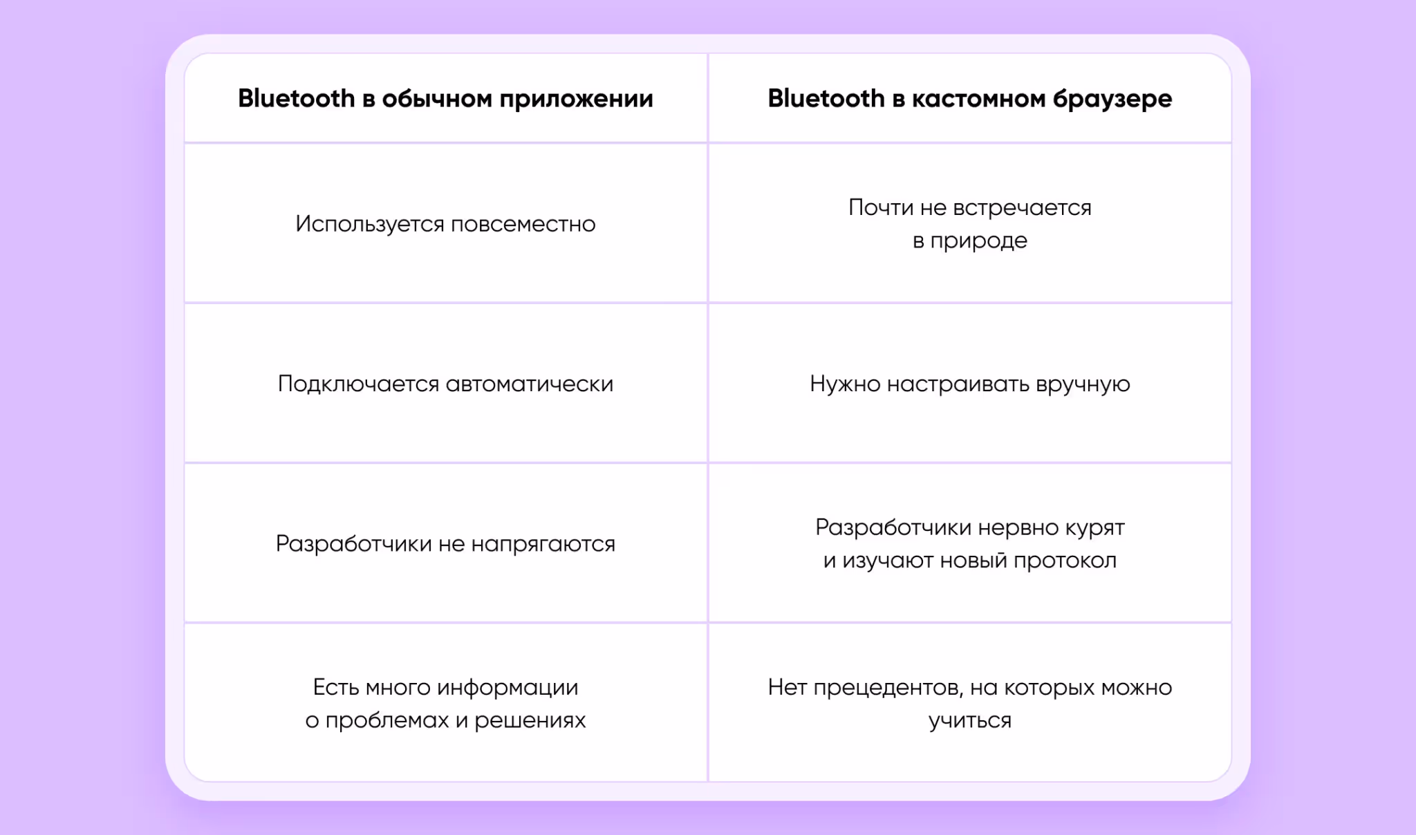 У браузеров все иначе. Если у мобильного Chrome на Android есть поддержка Bluetooth API, то у Safari такой функции просто нет — этот браузер не коннектится с Bluetooth. Занятный факт: «под капотом» все браузеры на айфоне — это Safari, поэтому ни один из них не подходил для нашего кейса.