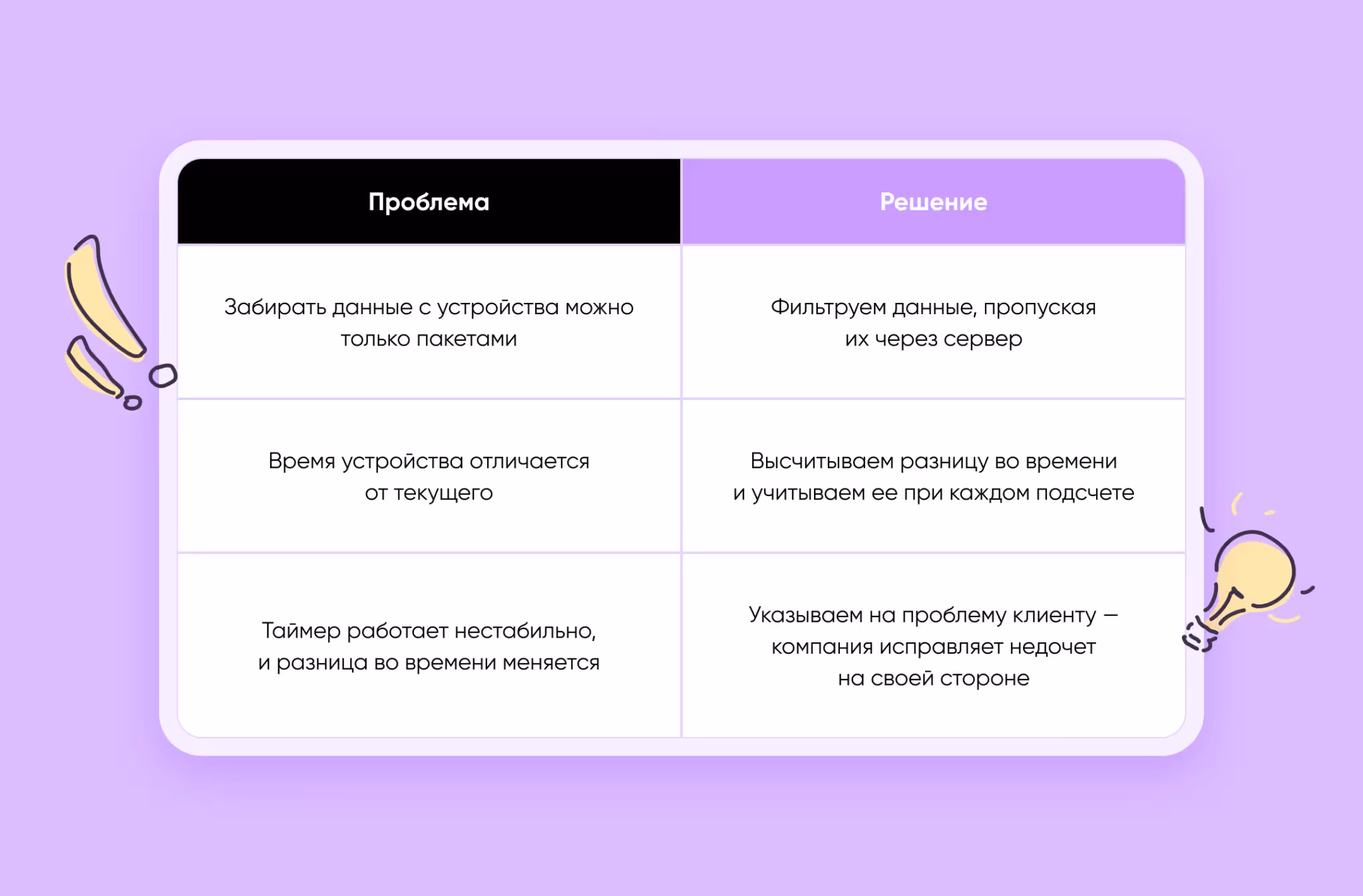 Пример: мы запрашиваем время устройства, сравниваем с текущим, разница оказывается 200 секунд. Запрашиваем еще раз, а она вдруг 196. Поэтому у одной и той же затяжки оказывалось разное время. Клиенты исправили недостаток на своей стороне, но мы потратили время на его обнаружение.