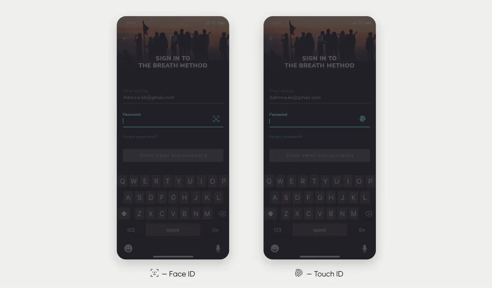 Для нас это был первый проект, в котором нужно было писать вход по Face ID, поэтому мы предполагали, что это не просто. Фичу сложно назвать важной в случае с приложением для дыхания, но заказчик настаивал на ней. Мы заложили два полных дня на реализацию, но справились за один: все оказалось гораздо проще. Сделали так, что приложение само определяет, есть на телефоне Face ID/Touch ID или нет. Если распознавание лица есть, вход по нему, если по отпечатку, по отпечатку, а если этих фич нет, приложение попросит придумать код-пароль.