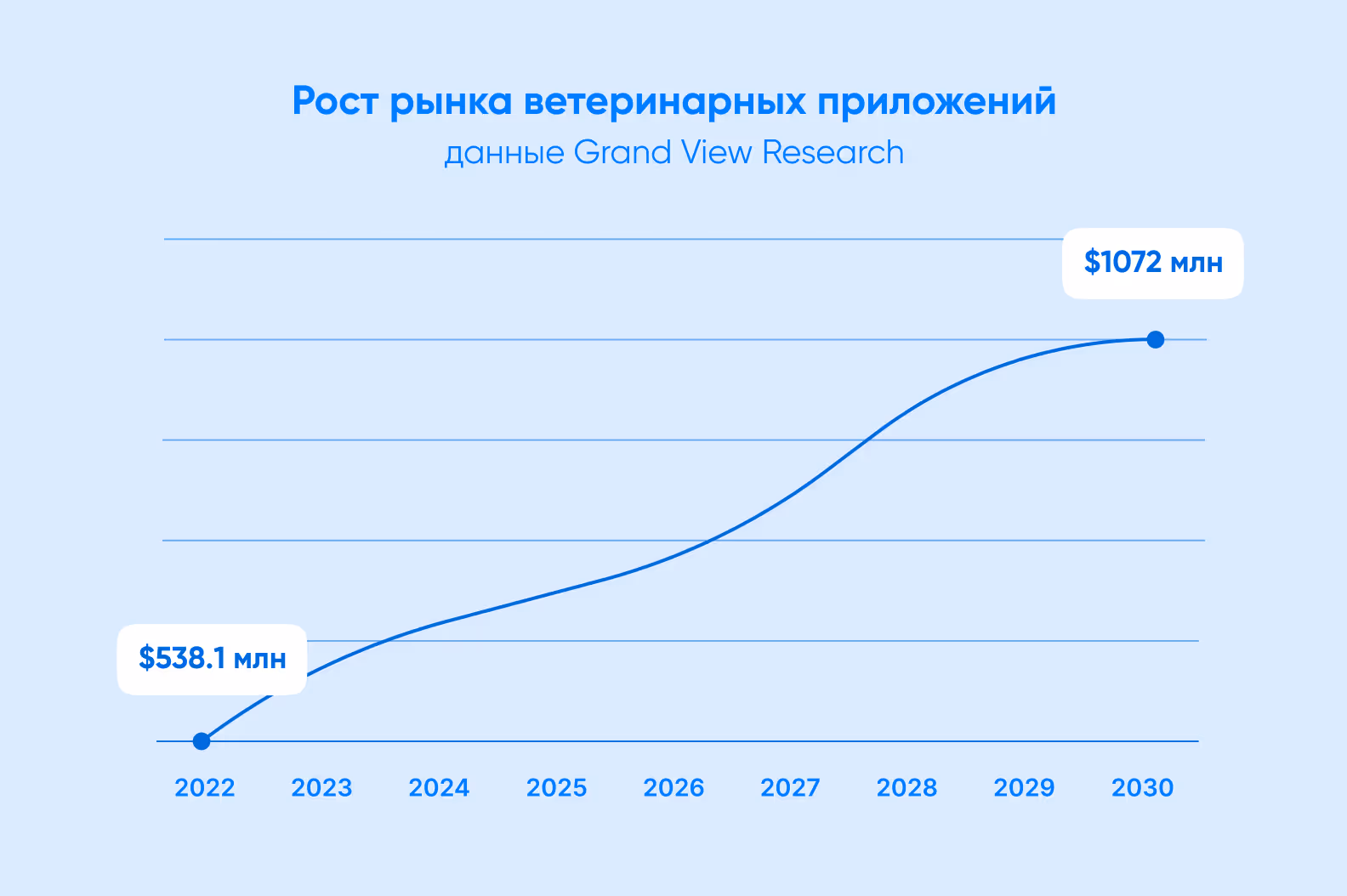 С деньгами все тоже в полном порядке. В 2021 году жители Европы (в том числе России) потратили на еду и услуги для питомцев $20,3 млрд ( FEDIAF), а американцы — $34,3 млрд ( APPA). В 2022 году емкость рынка мобильных приложений по уходу за домашними животными составила $538.1 млн, и ожидается, что к 2030 году эта цифра вырастет почти в два раза — до $1.072 млрд ( Grand View Research).