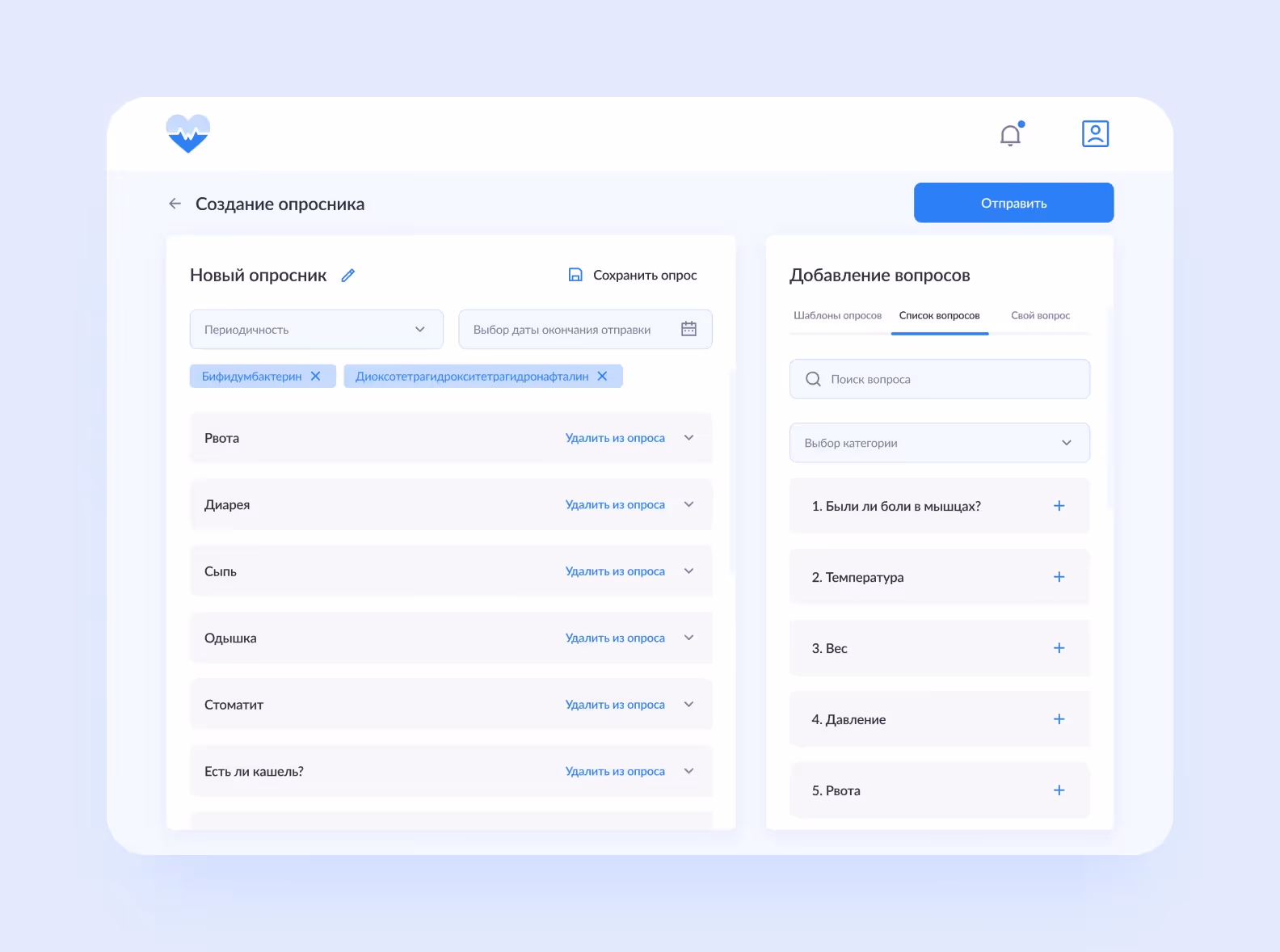 Кастомные опросы. Врач прикрепляет к пациенту рекуррентный (повторяющийся) опрос о его состоянии. Список вопросов зависит от схемы лечения. Приложение отправляет пациенту уведомления о том, что пришел опрос, так часто, как указал врач: каждый день / через день / раз в неделю или месяц.