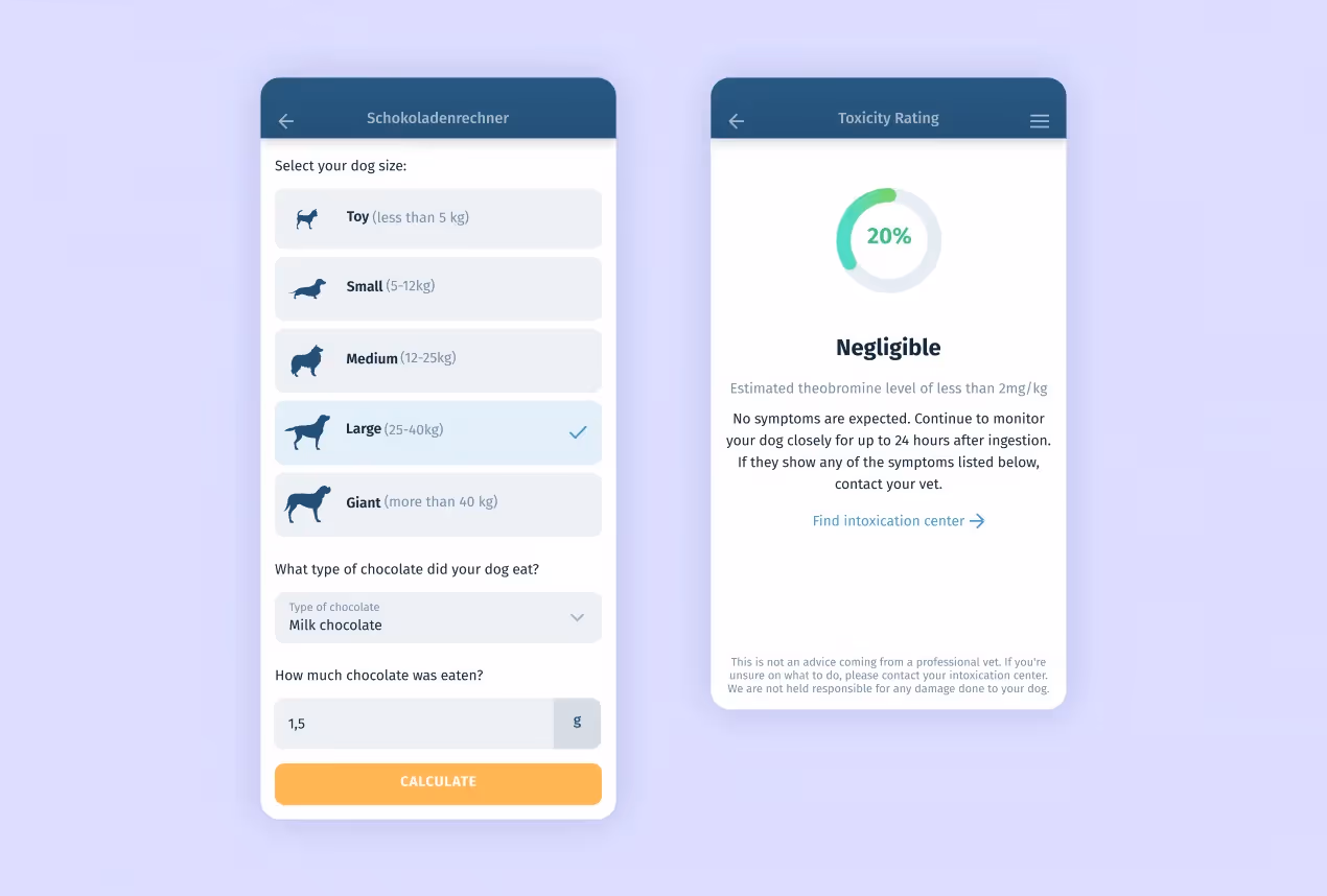 3. Калькулятор шоколада — он нужен, чтобы хозяин знал, не съел ли питомец смертельную дозу шоколада. Эту идею подала заказчица — она рассказала, что питомцы часто «подворовывают» шоколад и едят без спроса. А шоколад в больших дозах смертельно опасен для собак. Хозяева паникуют и бегут к врачу, хотя опасную дозу шоколада можно рассчитать самостоятельно исходя из веса питомца;