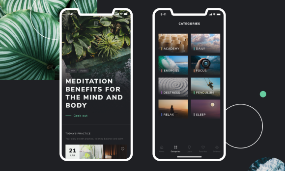 An app with breathing exercises. Helps city dwellers to relax. Contains articles, audio lessons and breathing techniques to calm and better yourself. The design evokes a feeling of reuniting with nature. Additional features: TouchID and FaceID login, a custom admin panel and Instagram feed inside the app.